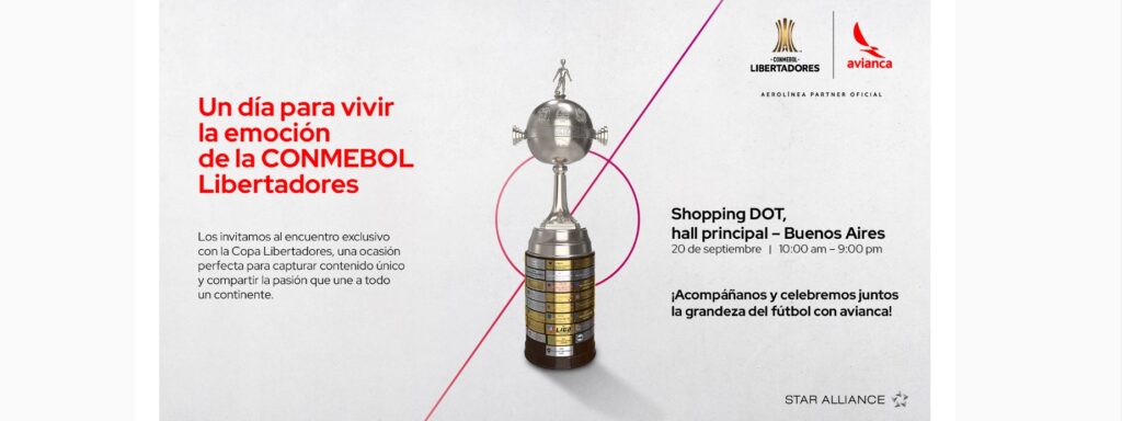 El próximo 20 de septiembre, la copa más emblemática del fútbol sudamericano estará en exhibición en el hall principal del Shopping DOT (Buenos Aires), para que los fanáticos del futbol puedan tomarse una fotografía y llevarse un recuerdo exclusivo del trofeo que representa la máxima gloria del continente.