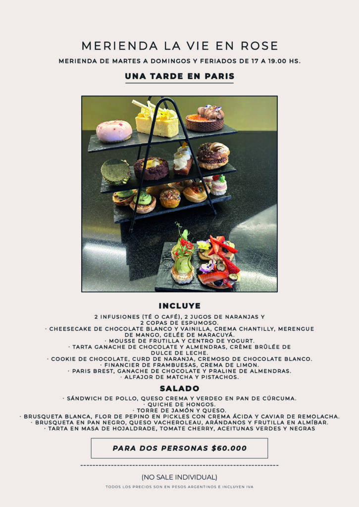 (Todos los precios son en pesos argentinos e incluyen IVA. La merienda es para dos