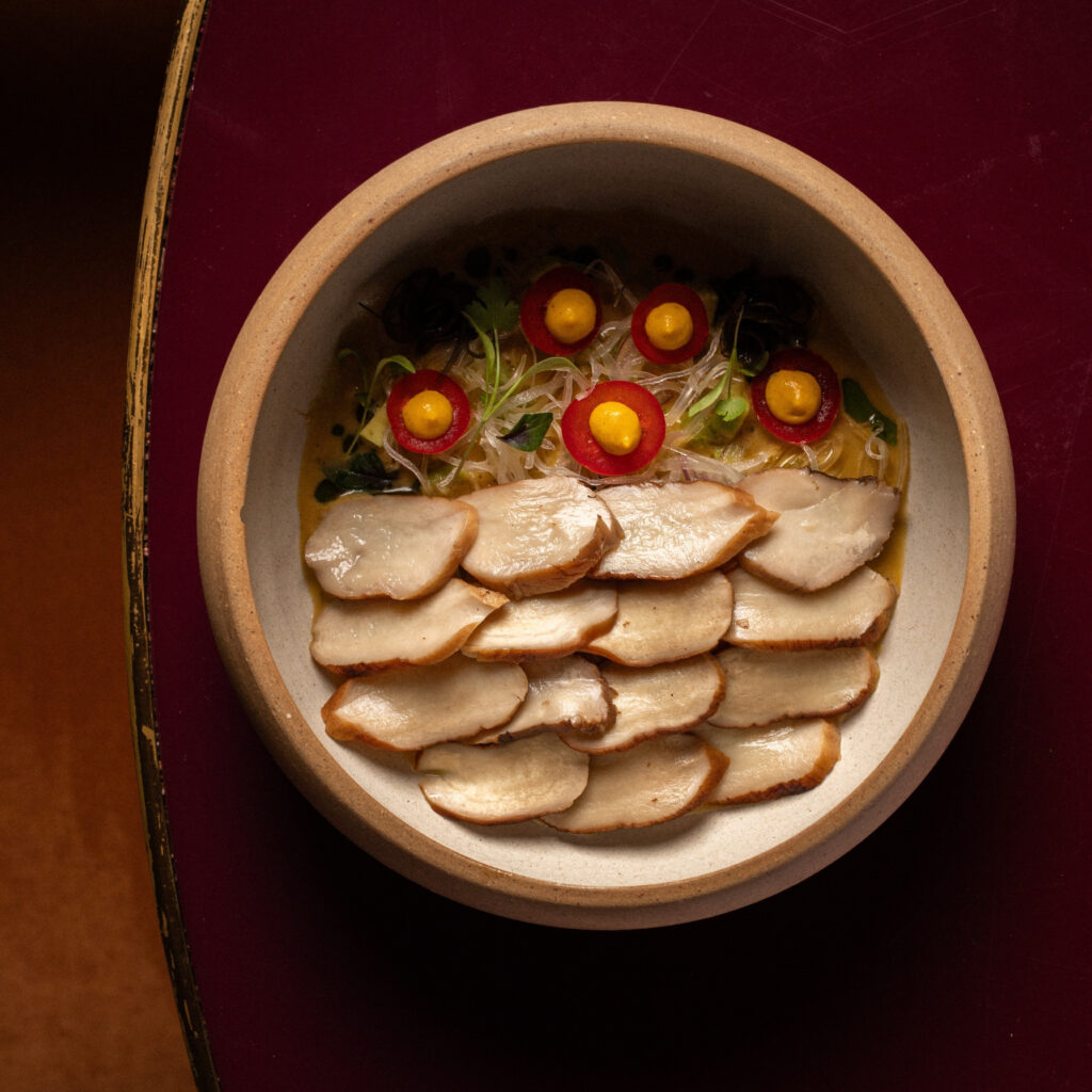 Ese enfoque se expresa en entradas como las ostras, un bocado concebido como un “shot” que abre la experiencia en una reinterpretación del cóctel Paloma, donde se trabaja el tequila con pomelo y lima en una espuma ligera que realza el carácter salino del molusco, se suma cucamelón de la huerta, que aporta acidez y textura, y se termina con sal de togarashi y perlas gelificadas de ponzu. En una línea fresca y levemente picante, se inscribe también el ceviche de hongos ahumados con leche de tigre, palta, apio y cebolla, crema de ají amarillo y maíz cancha. Otros destacados son la tarteleta de remolacha y frutillas deshidratadas, queso de cabra y gel de hibiscus; y el coliflor tandoori con labneh, curry tandoori, ensalada de hierbas, granada y pan naan, cada plato con capas de sabor y una identidad propia.